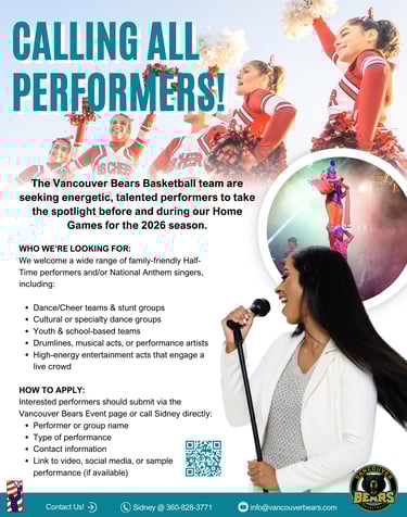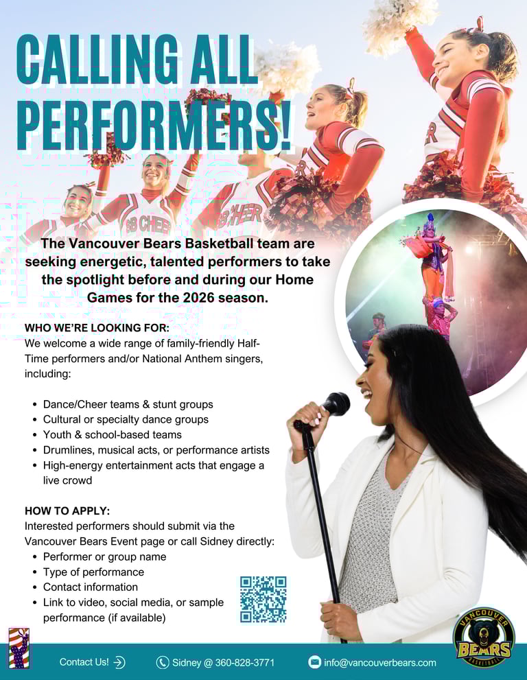 Register for your chance to perform at our 2026 Home Games (12 games total). We are seeking talented groups or individuals to sing the National Anthem as well as Half-Time Performers. You can also contact Sidney directly for more information.